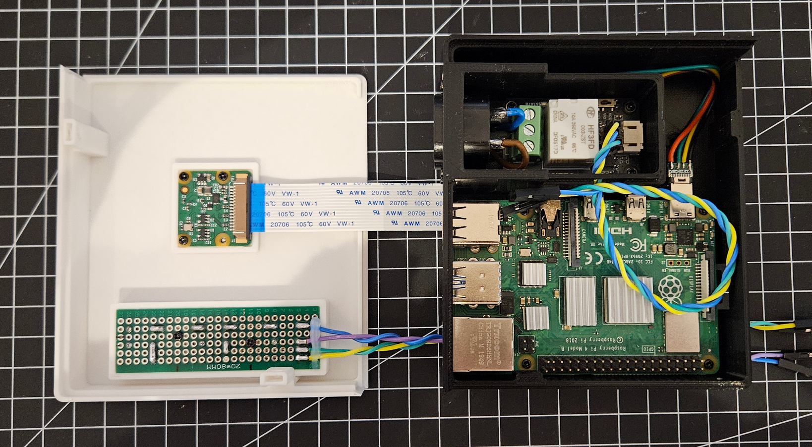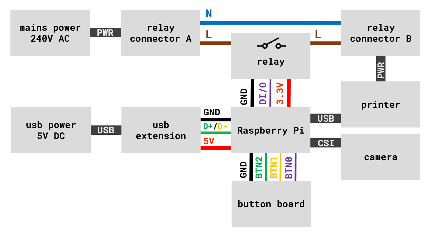Next, the relay is used to toggle mains power to the printer, which in Germany is \(240V\) AC. As such, I designed a separate, enclosed compartment with a dedicated cap so it doesn't interfere with any of the low-power components. To better understand how everything is connected, take a look at the project's wiring diagram.