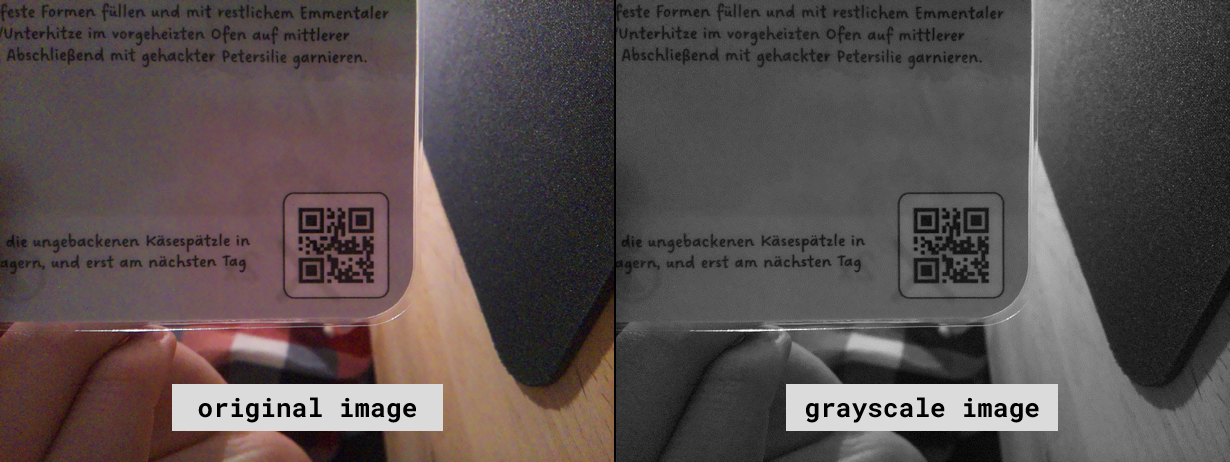 The first major step is converting the image to grayscale. This greatly reduces the complexity, as instead of three channels \((R,G,B) \in [0, 255]^3\), one for each primary color (red, green, blue), we end up with a single channel \(S \in [0,255]\), where \(S = 0\) is black and \(S = 255\) is white. It is also helpful to scale the image down as much as possible. In my setup, the camera captures images at \(1640 \times 1232\) pixels, and I was able to reduce them to just \(30\%\) of their size before the QR-code detector stopped recognizing anything.
