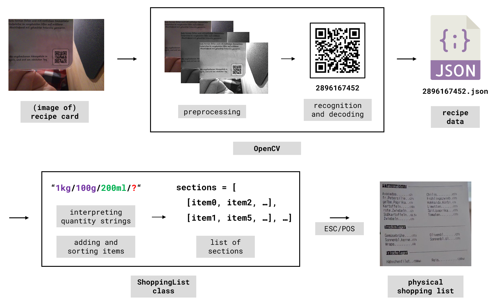 There are four major components to this project: A Raspberry Pi, which is essentially a Linux-based computer the size of a credit card, a tiny camera, a thermal printer, and the recipe cards, each equipped with a QR-code containing a unique ID. Using a Raspberry Pi for this project has several advantages, the most important being access to powerful libraries like OpenCV for recognizing and decoding QR-codes, and ESC/POS for sending commands to the printer via USB. It's also quite convenient to edit the code running on the Raspberry Pi, as I can SSH into it directly from VSCode using this plugin (crucial for easily adding new recipe data).