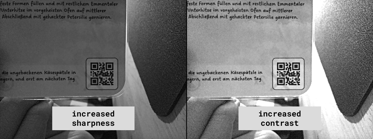 Considering what defines a QR-code two aspects come to mind: edges and contrast, since it is essentially a grid of black and white squares. Therefore, it's sensible to enhance exactly these features. To emphasize edges in an image \(I\) subtract a blurred version \(B\) of the same image by applying the update \(I \gets \tfrac{3}{2} I - \tfrac{1}{2} B\). This technique is known as unsharp masking. To increase contrast in an image update each pixel by applying \(I \gets \text{clamp}( \alpha I + \beta\mathbb{1})\), where \(\mathbb{1}\) is the matrix full of ones, and '\(\text{clamp}\)' restricts each value of a given matrix to \([0,255]\). This results in higher pixel intensities and therefore stronger contrast.